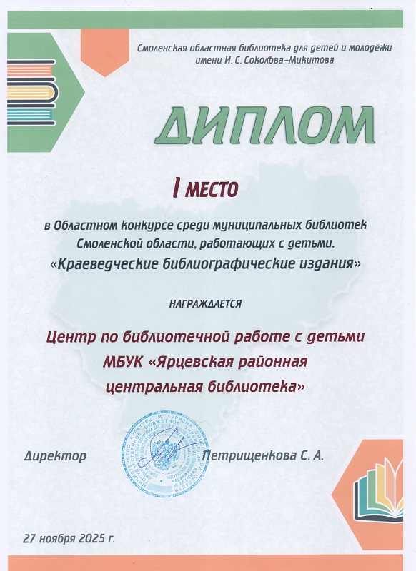 Подведены итоги Областного конкурса среди муниципальных библиотек Смоленской области, работающих с детьми, «Краеведческие библиографические издания» (организатор - Смоленская областная библиотека для детей и молодёжи им. И.С.Соколова-Микитова). Представленное центром по библиотечной работе с детьми краеведческое издание «Гордость Ярцевской земли» (автор-составитель – ведущий библиотекарь Т.В. Цветкова) заняло первое место в номинации «Биобиблиографическое издание». Библиотека награждена Дипломом и ценными призами.